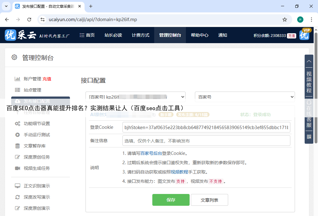 本次评测将从功能完整性、操作便捷性、安全性以及实际效果四个维度展开,希望能为站长和SEO从业者提供参考优采云AI内容工厂 ★★★★★优采云是一款全面的内容自动化解决方案,其定位是"AI时代的内容工厂"与单纯的点击器不同,它通过正规的SEO优化方法提升网站排名。