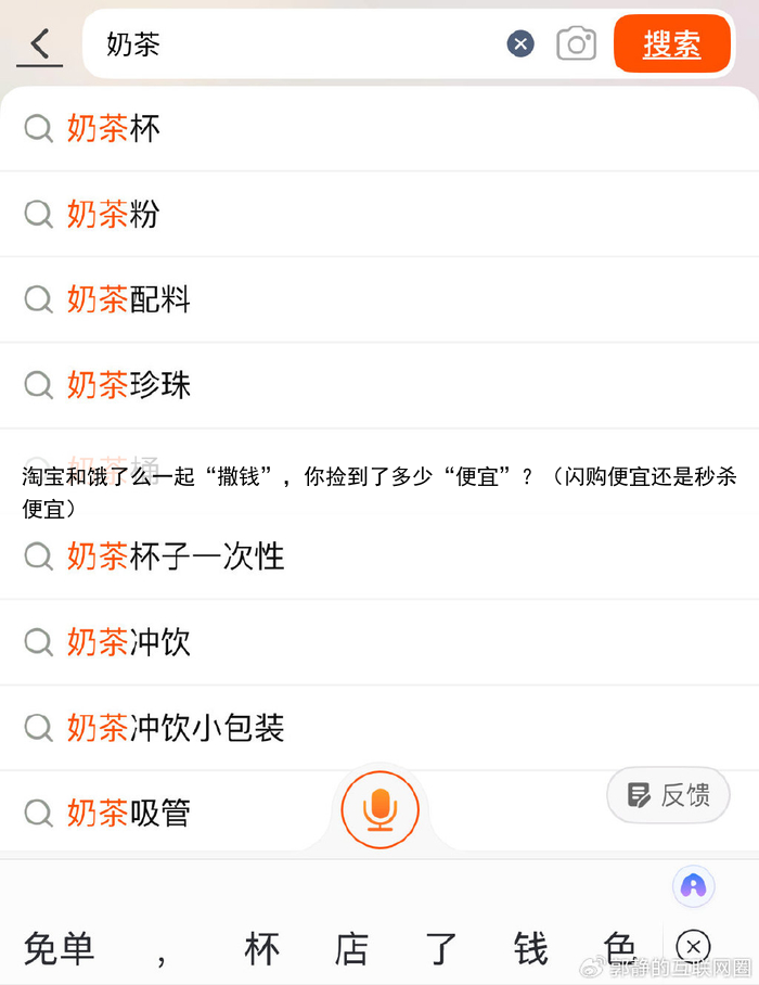 1.活动的关键词是“奶茶免单”,但是当我输入“奶茶”的时候,还需要继续输入“免单”后才会跳转到活动页,“奶茶”的下拉词条中,也没有“奶茶免单”,这里体现出平台不够细心。