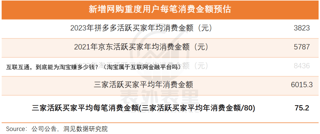 基于此,按照淘天交易规模占电商大盘45%的比例来计算,可知:微信独占高频用户每年有36次购物会分给淘天以拼多多、京东与淘天上活跃买家的年均消费金额为参考,可以估算出这批用户每次“买买买”的花费大约为75.2元。