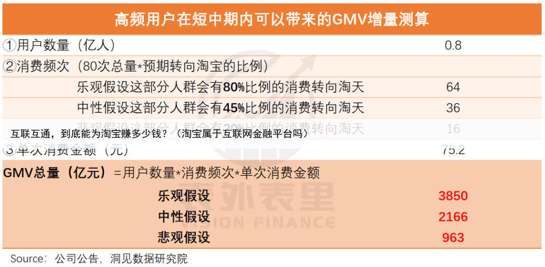 而本来就用淘宝的微信用户,根据QM数据有8.16亿,在“屏蔽墙”打破后,他们将释放更多消费潜力我们按照「GMV=用户数×单用户消费总金额=用户数×消费频次×单笔消费金额」的思路,对不同用户群体能带来的增量价值分别进行测算。