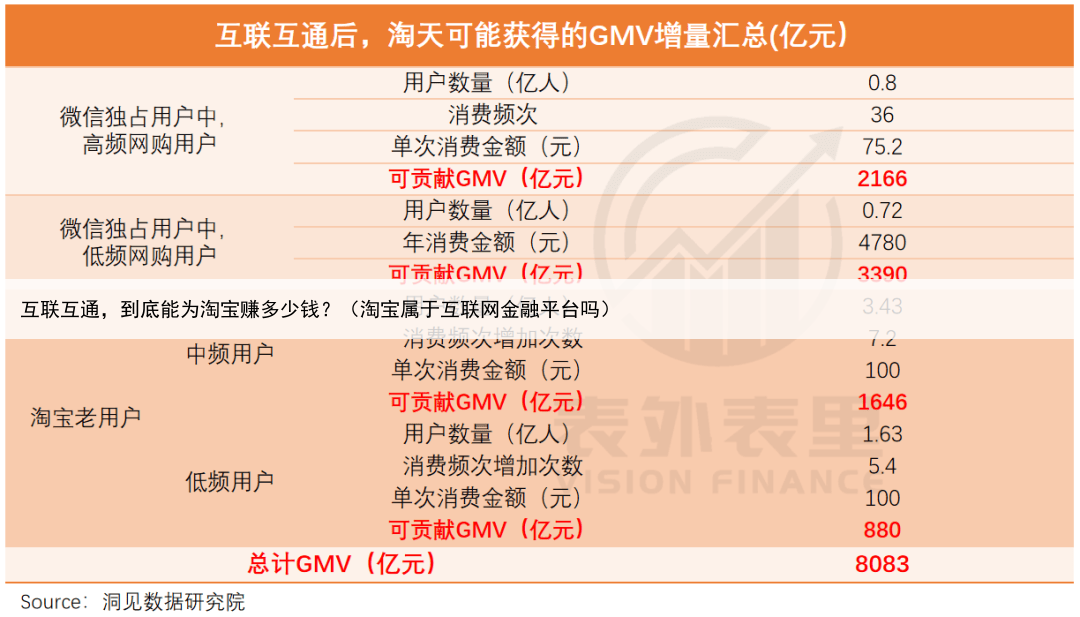 “拆墙打通”之后,之前被微信独占的用户就成了淘天潜在的新用户,而原本就用淘宝的微信用户则可能提高消费频次,这两群人都将带来一定的GMV增量。