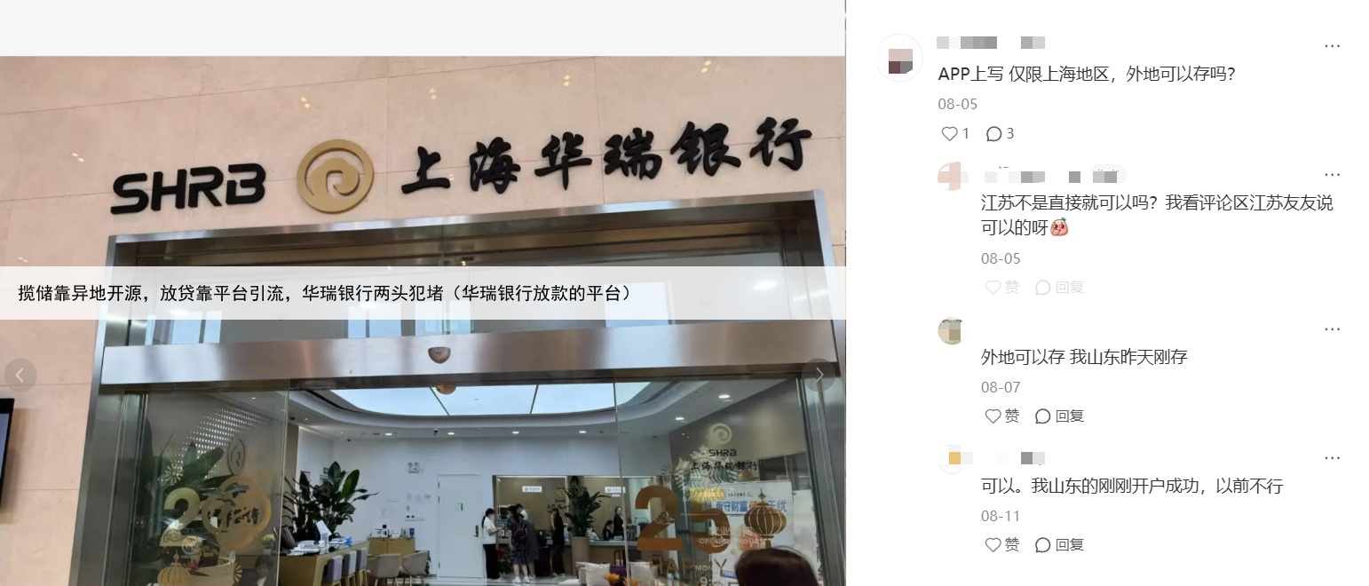 类似案例在社交平台并不鲜见。在小红书等平台,关于华瑞银行异地存款的讨论屡见不鲜,不少网友表示,即便身处上海之外,也能通过线上渠道成功存款。