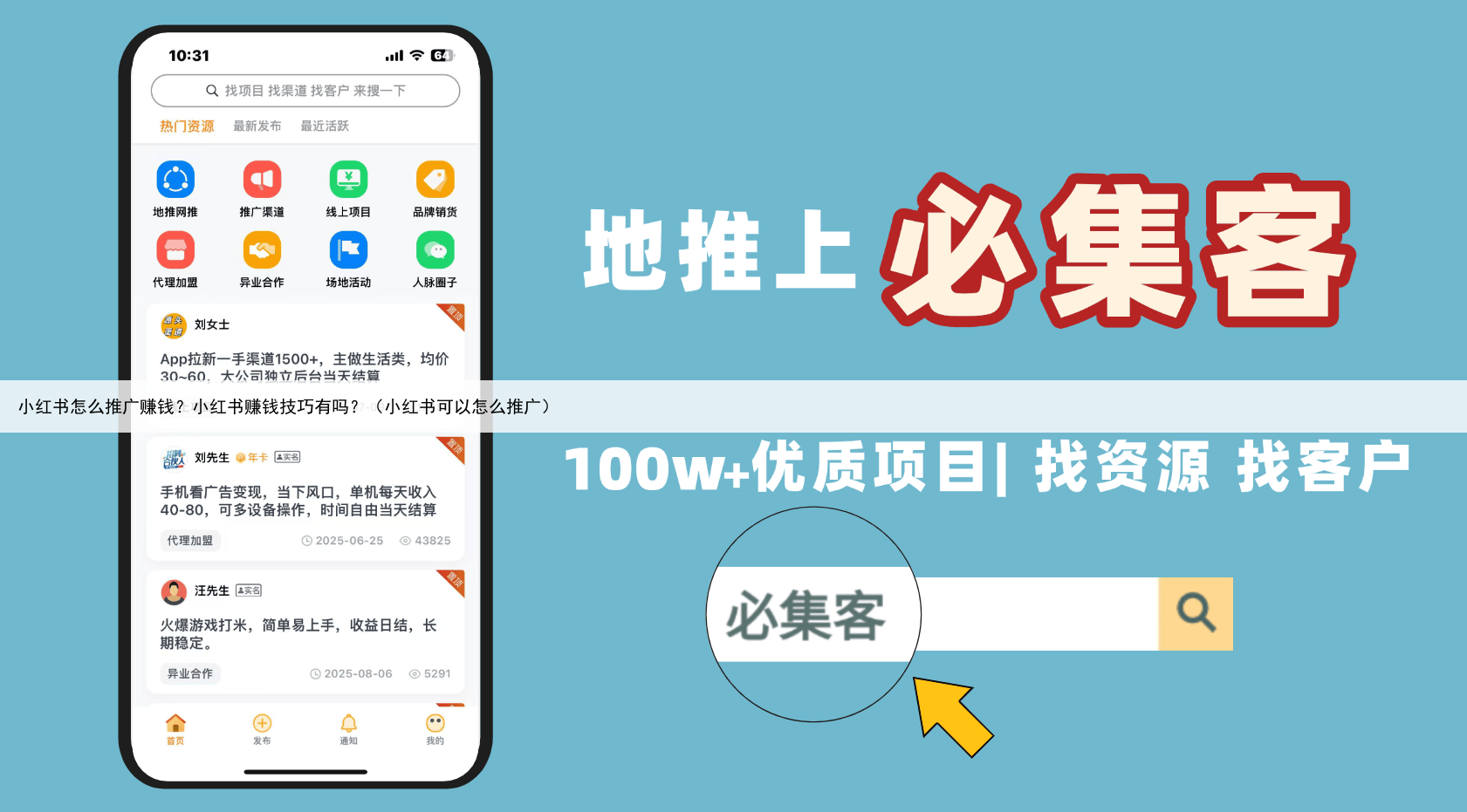 三、小红书赚钱技巧分享!这点3必看!1.使用地推app接任务平台:必集客通过地推app接任务平台必集客app这个地推行业的巨头,我们可以轻松对接小红书的推广赚钱项目这一类平台通常会提供丰富的推广任务供我们选择,需要注意选择靠谱可信的平台,随后我们就可以根据自己的时间和能力选择合适的任务进行推广了。