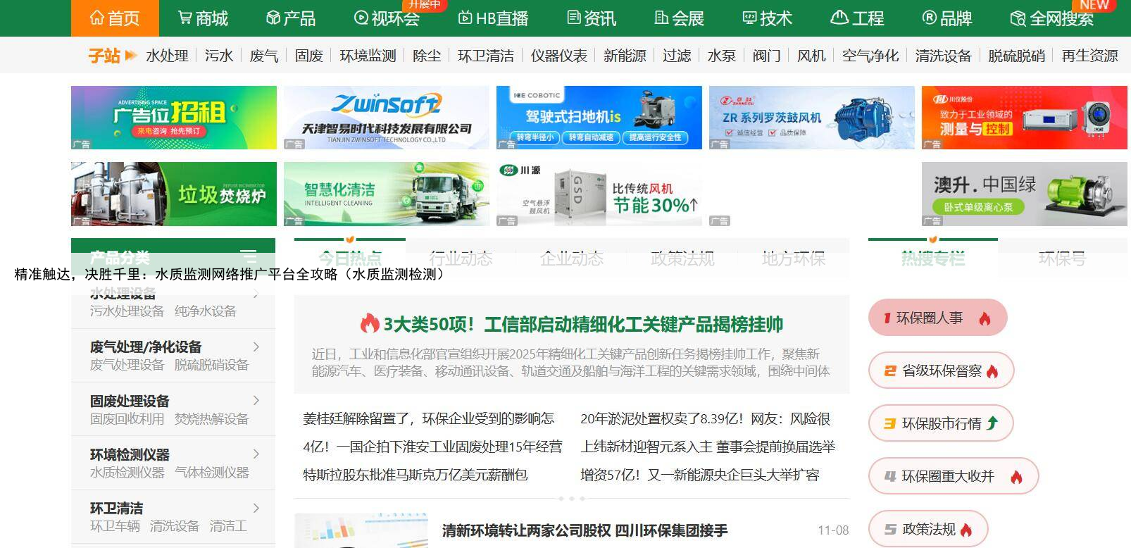 作为环保领域核心B2B平台,覆盖水质监测设备、解决方案及行业资讯,日均流量超50万企业可通过开通VIP会员、发布产品动态及参与行业专题(如“智慧水务”“流域治理”)提升曝光平台支持在线询价与供应商对接,适合设备厂商与工程服务商拓展政企客户。