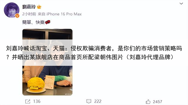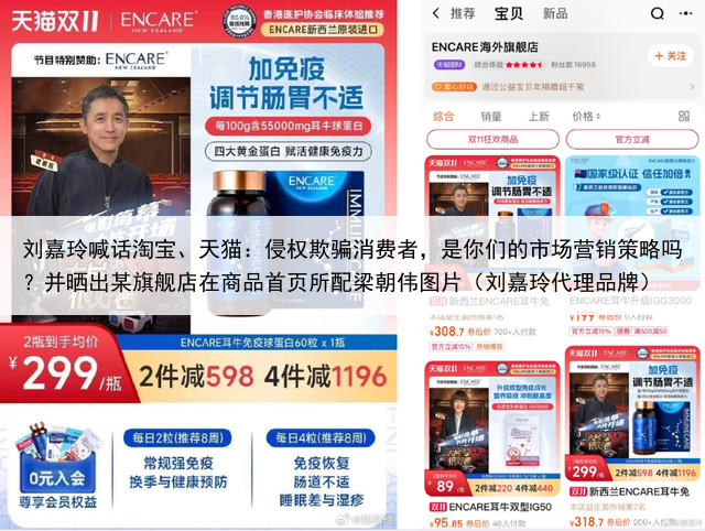 刘嘉玲喊话淘宝、天猫:侵权欺骗消费者,是你们的市场营销策略吗?并晒出某旗舰店在商品首页所配梁朝伟图片(刘嘉玲代理品牌)
