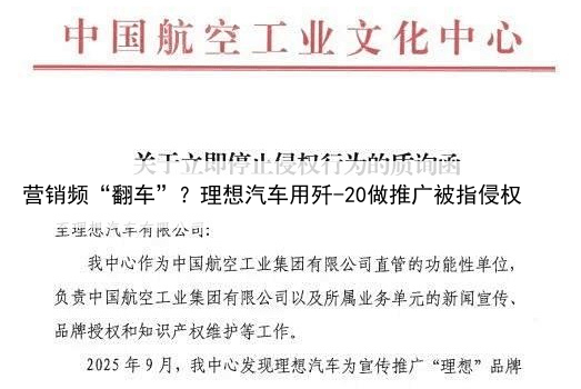 放大看理想汽车又在营销上“翻车”因在宣传中未经授权使用歼-20、歼-10、空警-500等机型形象,理想汽车陷入了一场知识产权侵权争议近日,中国航空工业文化中心发出质询函,指出理想汽车在9月的品牌宣传中,未经授权擅自使用“歼-20、歼-10、空警-500”等机型形象,并配以《与国同梦与家同行》主题进行传播,涉嫌严重虚假宣传及知识产权侵权,要求其立即删除侵权内容、公开道歉,并保留法律追责权利。