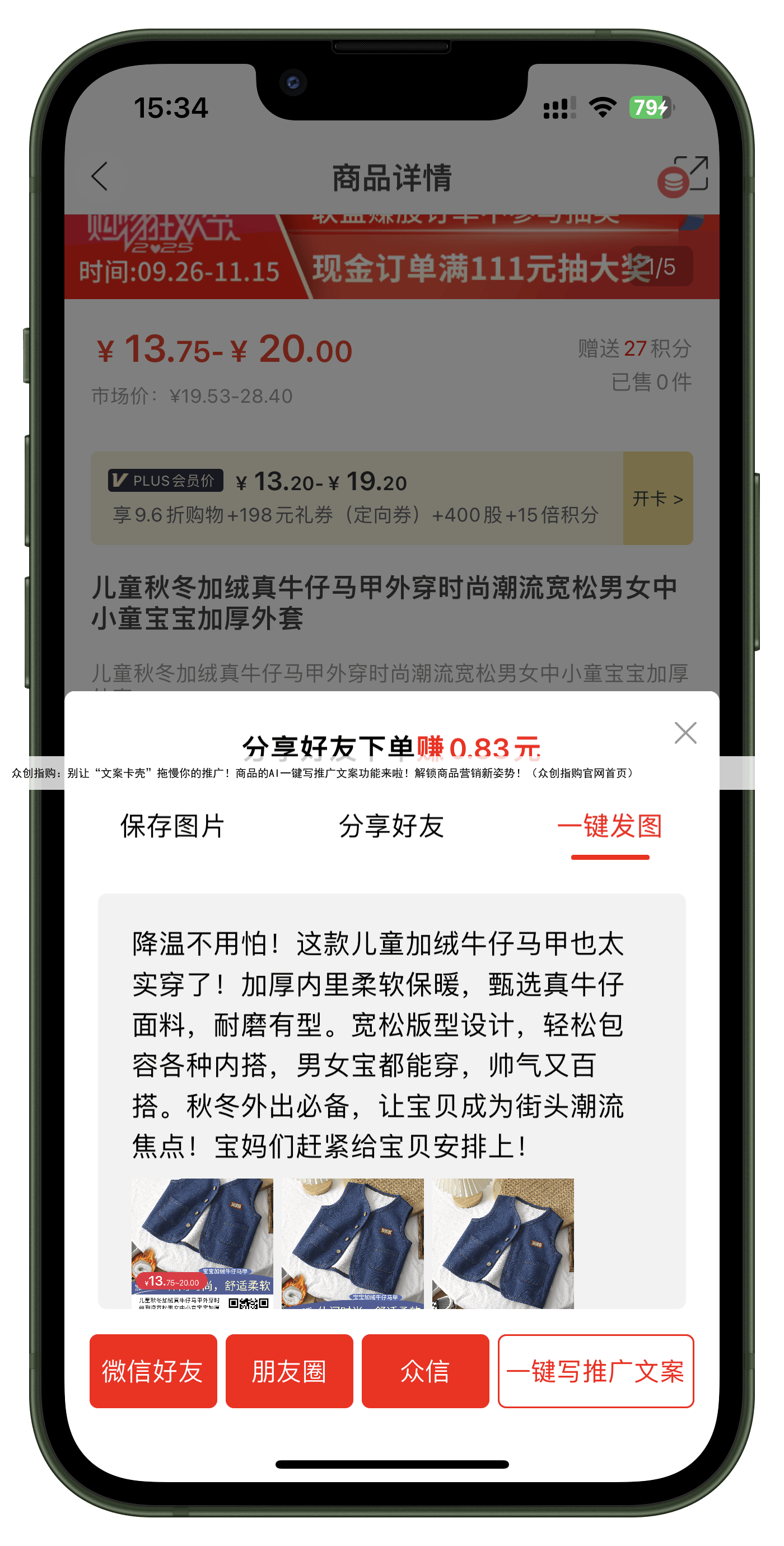 对于众创指购合伙人来讲,即便没有专业的文案创作能力,也能借助该功能轻松产出专业级别的推广内容,在微信好友、朋友圈、众信等渠道分享时,大幅提升商品的吸引力,一键创作后一键分享至各大社交平台,轻松锁客拓客!