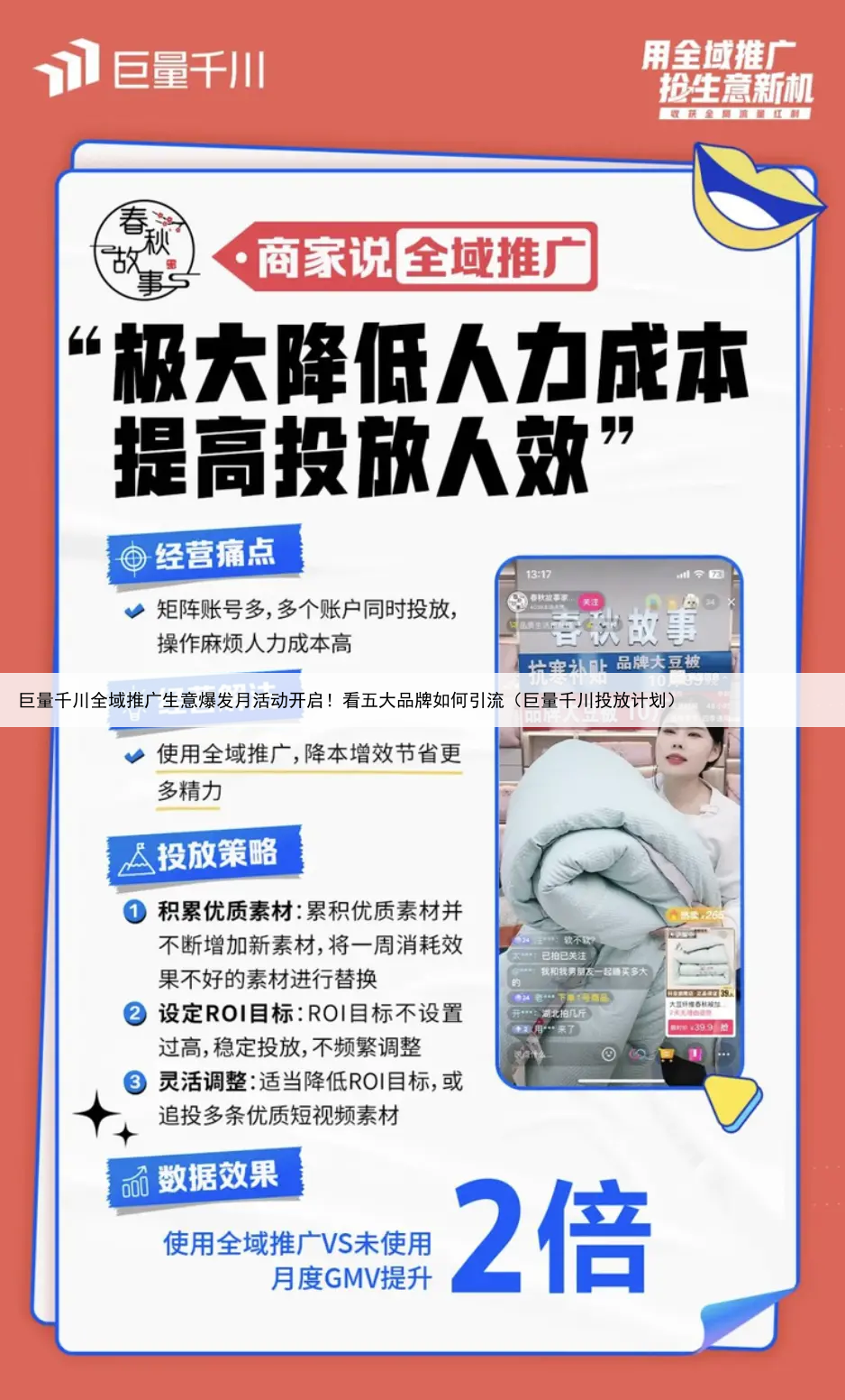 春秋故事品牌家纺说全域推广:极大降低人力成本,提高投放人效春秋故事品牌家纺的主要问题,表现为运营矩阵账号繁多、投手工作繁琐、不同账号投放效果不稳定等在使用全域推广前,每个直播间每天都需要搭建上百条计划,9个投手全速运营依然力不从心,忙起来甚至需要老板亲自上阵盯细节。