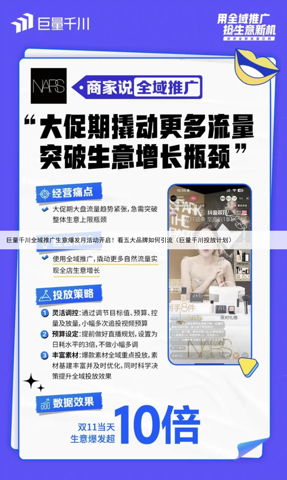 数据显示,使用全域推广后,品牌在双11当天生意爆发超10倍,同时为NARS带来更多商业机会,进一步提升品牌的销售额和市场占有率。