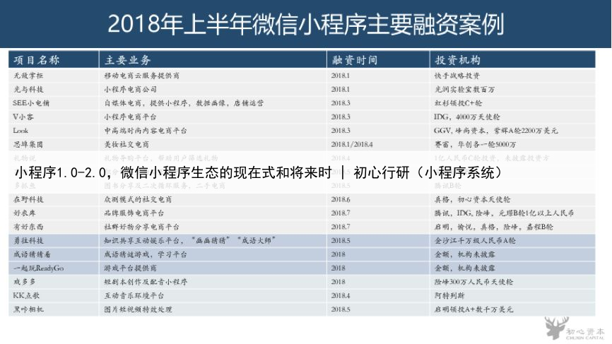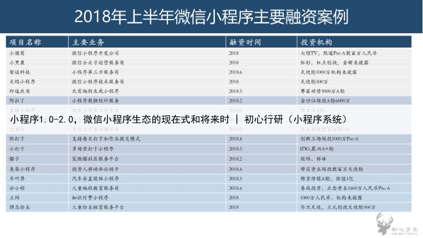 资本是行业的晴雨表,小程序俨然成了新一轮风口2017年小程序的投资额超7亿,2018年前几个月,就已经有超过10个小程序公司拿到千万融资上半年,我们对行业内数十名创业者进行过访谈,也聆听了微信团队对于下半年小程序创业的“官方指导”。