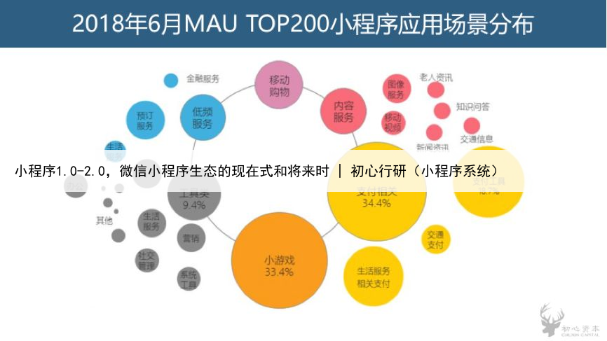 初心观点小程序的用户规模和传播力正呈现快速成长状态,商业模式进一步丰富生态早期,工具类的开发成本最低,所以工具类应用往往承担着教育用户、教育市场的作用随着时间推移,娱乐类、游戏类会逐渐增加2018年小游戏的爆发,不仅和腾讯战略有关,也和整个生态的成熟度有关。