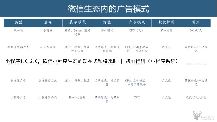 表中可以看出,小程序广告支持多纬度的用户筛选,找到目标用户目前小程序广告的展示形式仍然比较单一,且流量价值没有得到最大化利用但点击率和转化率较好,加上众多百万、千万级UV的小程序,以及官方的小程序广告平台出现,将使得小程序广告业务更为顺畅。