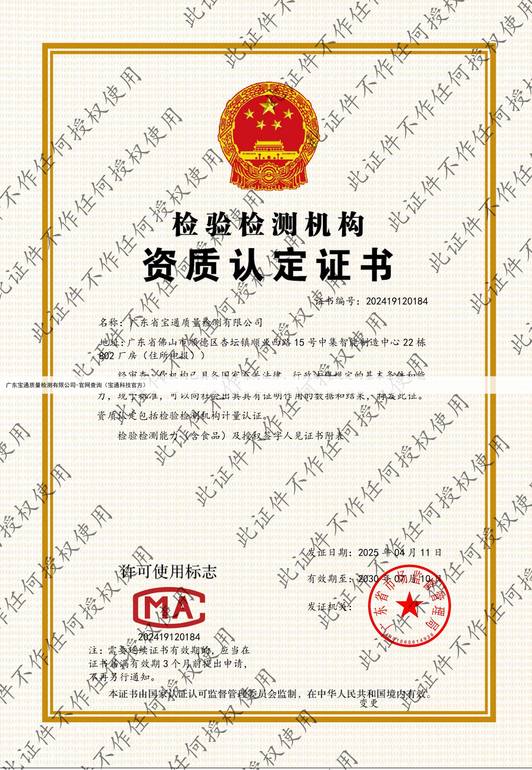 广东宝通质量检测有限公司 官方客服国家实验室资质CNAS资质编号L23122,省级实验室资质CMA资质编号202419120184实验室地址:广东省佛山市顺德区杏坛镇顺业西路15号中集智能制造中心22栋802厂房(住所申报)