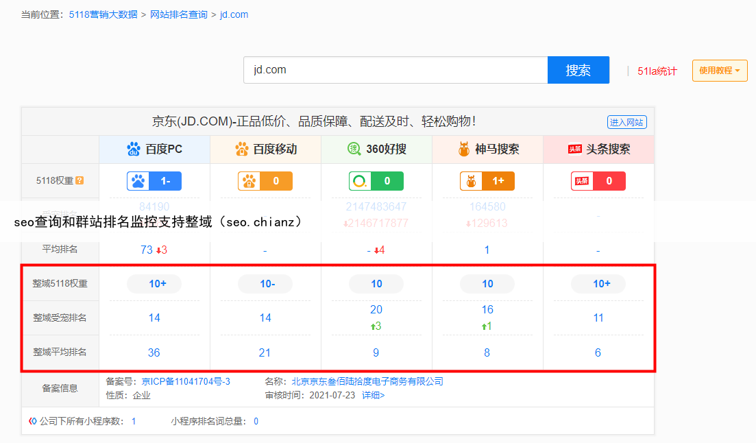 整域5118权重:查询域名对应的整个域名下的权重,自然排名词量越多,权重越高整域受宠排名:查询域名对应的整个域名下的排名,在整个互联网所处水平,得出的排名位置整域平均排名:查询域名对应的整个网站所有的排名平均位置,可侧面看平均排名是否靠前,判断该网站是否优质