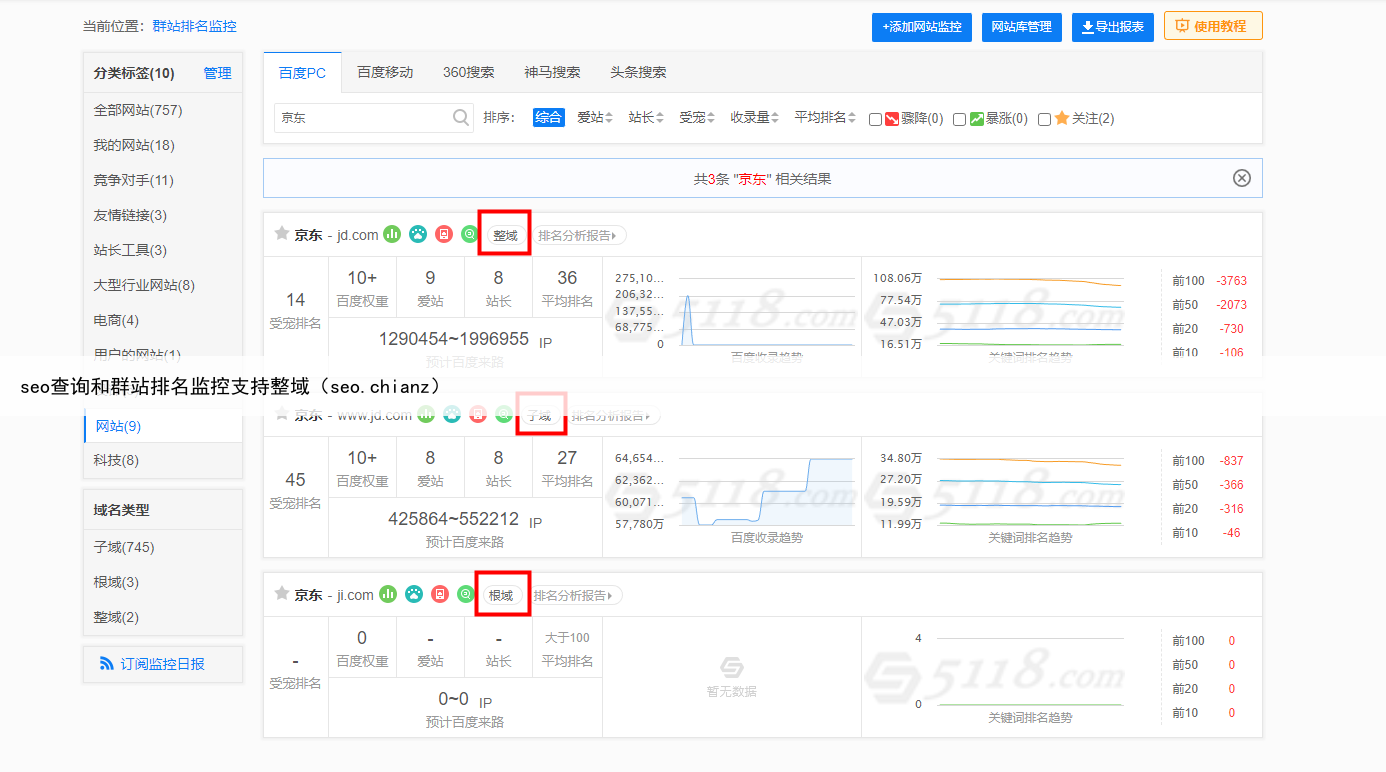 在已添加网站监控的数据列表中,会在每个网站后进行子域、根域、根域标注,便于对同个网站多类型域名添加监控后的进行区分,节省逐个打开网站时所消耗的时间,同时对多个域名进行数据对比,可以获得更加详细的网站分析报告