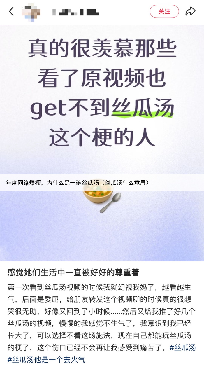比起低俗冒犯的梗,“丝瓜汤”既避免了吵架的脏话,又能展现出狠狠的攻击力无论对方说什么都可以回复——“你就是肝火太旺了,你知道吗?喝点丝瓜汤去一下火气吧”03丝瓜汤好喝的秘诀是什么?丝瓜汤梗,也是一种“代际创伤传递”。