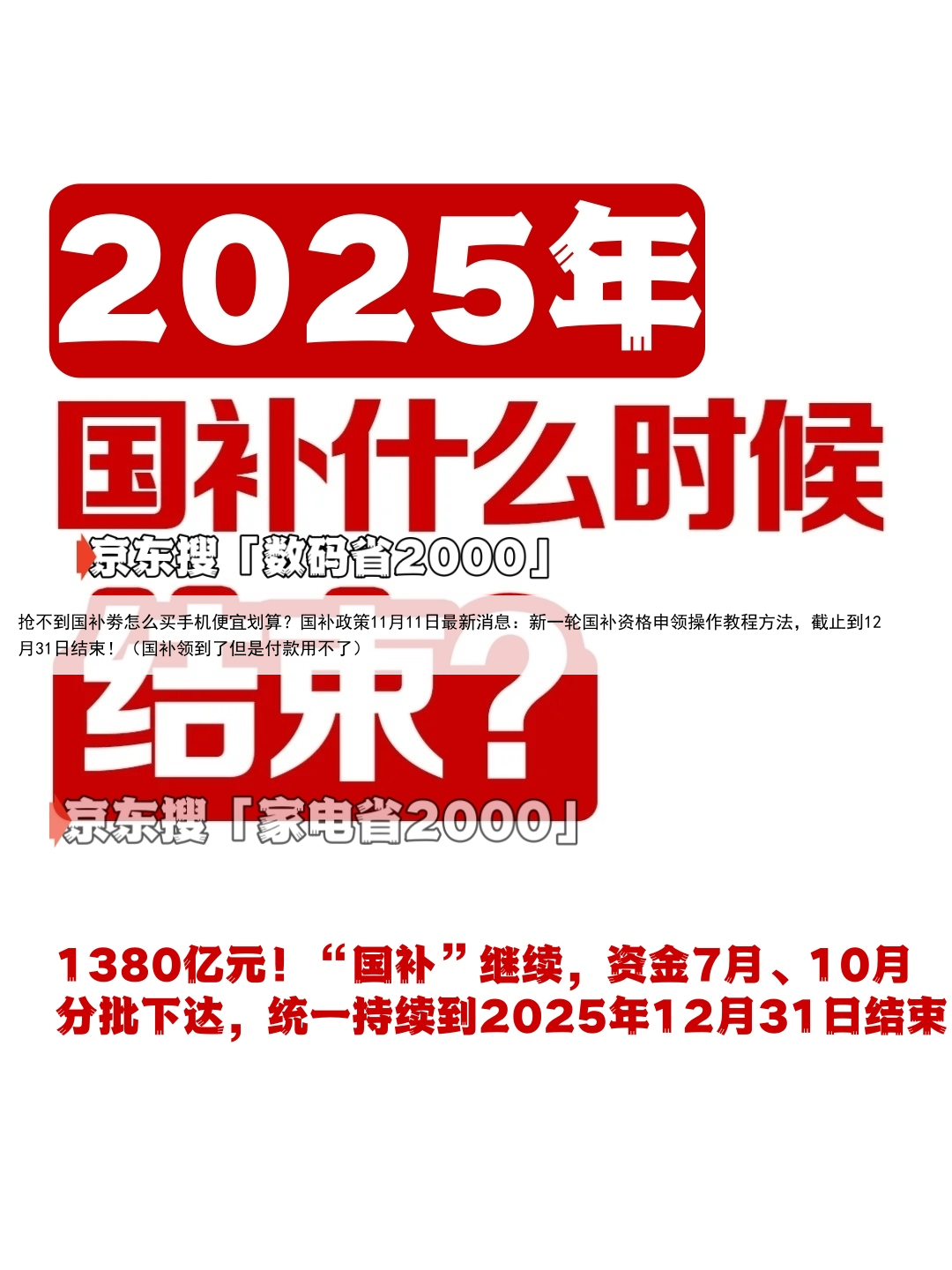 关键时间节点:第四批国补资格申领截止至2025年12月31日,但各地市额度实行"熔断机制",用完即止11月11日双11大促期间将迎来新一轮放量,但竞争也将达到顶峰建议在11月10日24点前完成"资格预授权"操作。