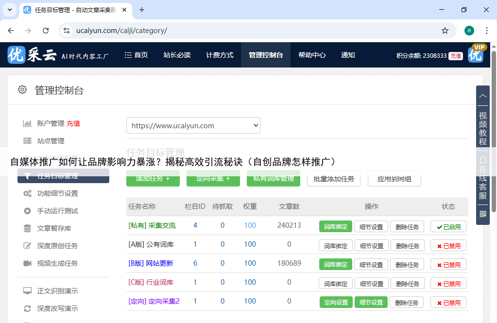 用户首先添加目标站点或自媒体账号,配置发布接口以实现自动发布,或选择本地下载任务目标可通过关键词或指定网址设置,系统据此采集或生成相关内容功能细节设置包括云端运行时间、文章需求量和原创算法,用户可自定义运行时段(如24小时运行或指定时间段),并启用防重复机制(如网址和内容指纹过滤),避免内容重复。