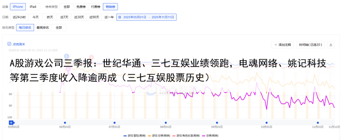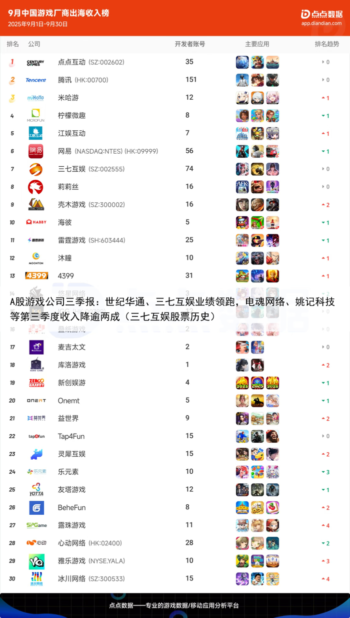 A股游戏公司三季报:世纪华通、三七互娱业绩领跑,电魂网络、姚记科技等第三季度收入降逾两成(三七互娱股票历史)