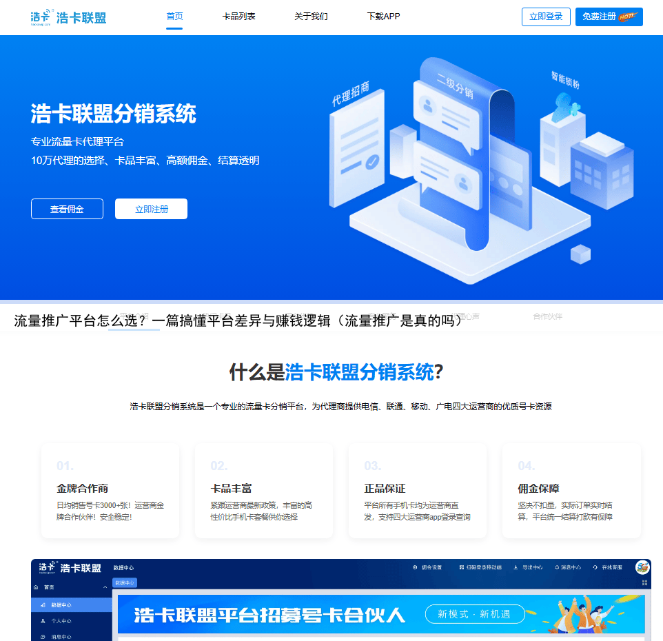 八、选平台,是你迈向稳定收益的第一步做流量卡推广,不是拼谁跑得快,而是拼谁“选对了起点”一个靠谱的平台,不仅能帮你少踩坑,还能让你的副业越做越顺如果你正在找一个起步门槛低、结算快、佣金高的平台,不妨亲自体验一下浩卡联盟。