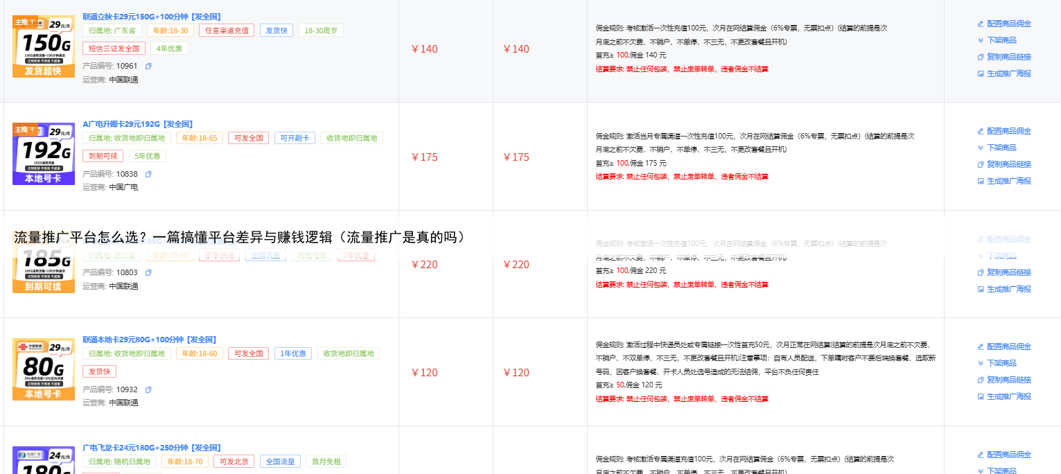 一、为什么“平台选对”这么重要?说句实在话,做流量卡推广这个事儿,不管你是刚刚接触副业,还是已经是老鸟,平台的选择都决定了你能不能长期赚下去举个简单的例子:有的人辛辛苦苦推了一个月,结果结算慢、佣金低、卡品卖不动,白忙活一场;。