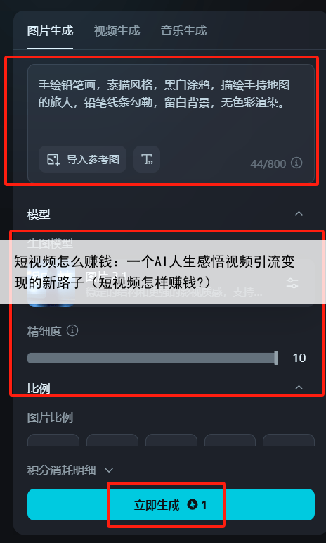 接着,我们需要给AI一些创作灵感,可以输入这段描述:手绘铅笔画,素描风格,黑白涂鸦,描绘手持地图的旅人,用铅笔线条勾勒,背景留白,没有色彩渲染记得把模型选为2.1,精细度拉到最高,比例设置成手机屏幕最适合的9:16,然后点击生成,见证奇迹的时刻就到啦!。
