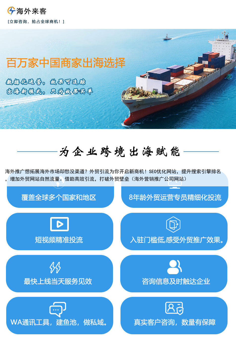 海外推广想拓展海外市场却愁没渠道?外贸引流为你开启新商机!SEO优化网站,提升搜索引擎排名,增加外贸网站自然流量。借助高效引流,打破外贸壁垒(海外营销推广公司网站)