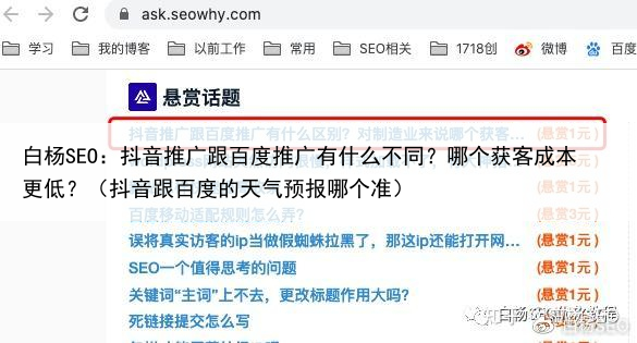 这个问题来源:上面说了写作背景,所以我想要了解下现在SEO从业者还在关心哪些问题,自然就去了夫唯老师的搜外问答,在悬赏处,看到了这个问题,如图: