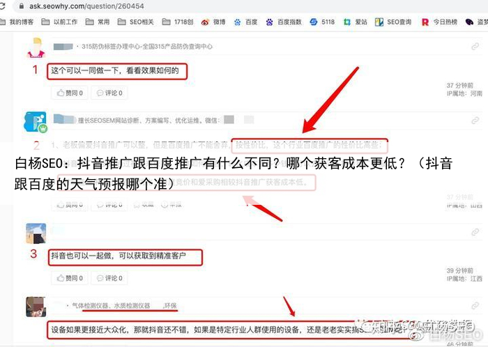 具体问题:抖音推广跟百度推广有什么区别?对制造业来说哪个获客成本更低?我们是非标自动化设备行业的,我刚来这家公司,老板最近想搞抖音推广,排斥百度推广,大伙帮我出出主意?白杨SEO:我们先审题哈,上面加粗为我标注哈。