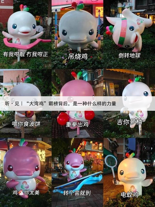 “大湾鸡”,本名“喜洋洋”和“乐融融”,原型为国家一级保护动物中华白海豚,头顶是由广东木棉红、香港紫荆紫、澳门莲花绿组成的三色小水花,象征粤港澳三地紧密相连网友:有鸡冠、有鸡翼,我不管,它就是鸡于是,一场“指豚为鸡”的网络乌龙就这么传开了……“大湾区”粤语发音顺势改为“大湾鸡”,加之当地人对白切鸡和豉油鸡的喜爱,一切都显得刚刚好。