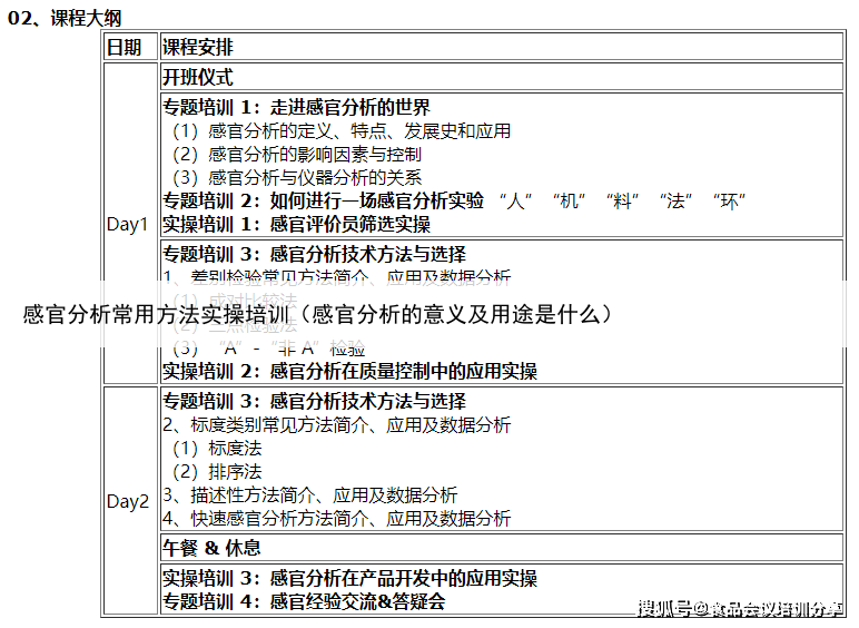 专题培训 3:感官分析技术方法与选择1、差别检验常见方法简介、应用及数据分析 (1)成对比较法 (2)三点检验法 (3)“A”-“非 A”检验 实操培训 2:感官分析在质量控制中的应用实操专题培训 3:感官分析技术方法与选择