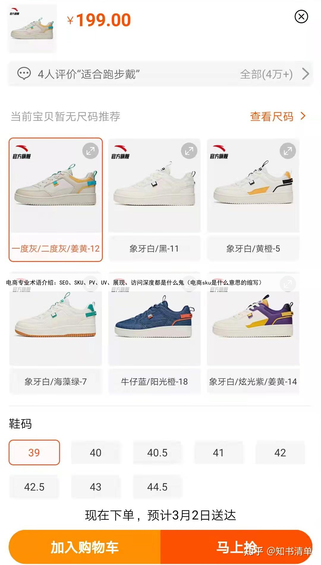 2、SKU(产品的款式数量) SKU,是指产品的款式,可以用来计算产品种类的数量。 【举个栗子】某款运动鞋,有8个尺码,6种颜色,那么一共就有8*6=48个SKU。