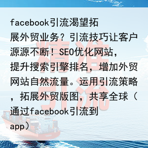 facebook引流渴望拓展外贸业务?引流技巧让客户源源不断!SEO优化网站,提升搜索引擎排名,增加外贸网站自然流量。运用引流策略,拓展外贸版图,共享全球(通过facebook引流到app)