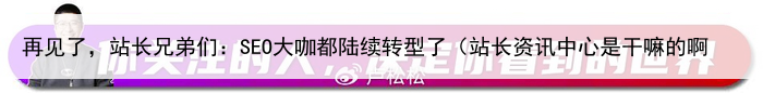 只不过不像我,我是直接表达出来了,大佬表达很隐晦而现在SEO大咖都陆续转型了,你看连我都在拍短视频了,你还在等什么呢?关注卢松松,一起进入社群交流吧,因为你关注的人,决定你看到的世界!