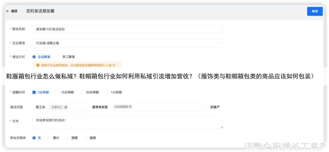 例如,可以发布时尚穿搭指南、品牌故事、产品设计理念等内容,吸引用户的兴趣,并通过互动和评论,与用户建立更紧密的联系借助语鹦企服的「定时群发」和「定时朋友圈」功能,不仅可以设置群聊&私聊定时群发任务,还可以设置朋友圈群发任务。