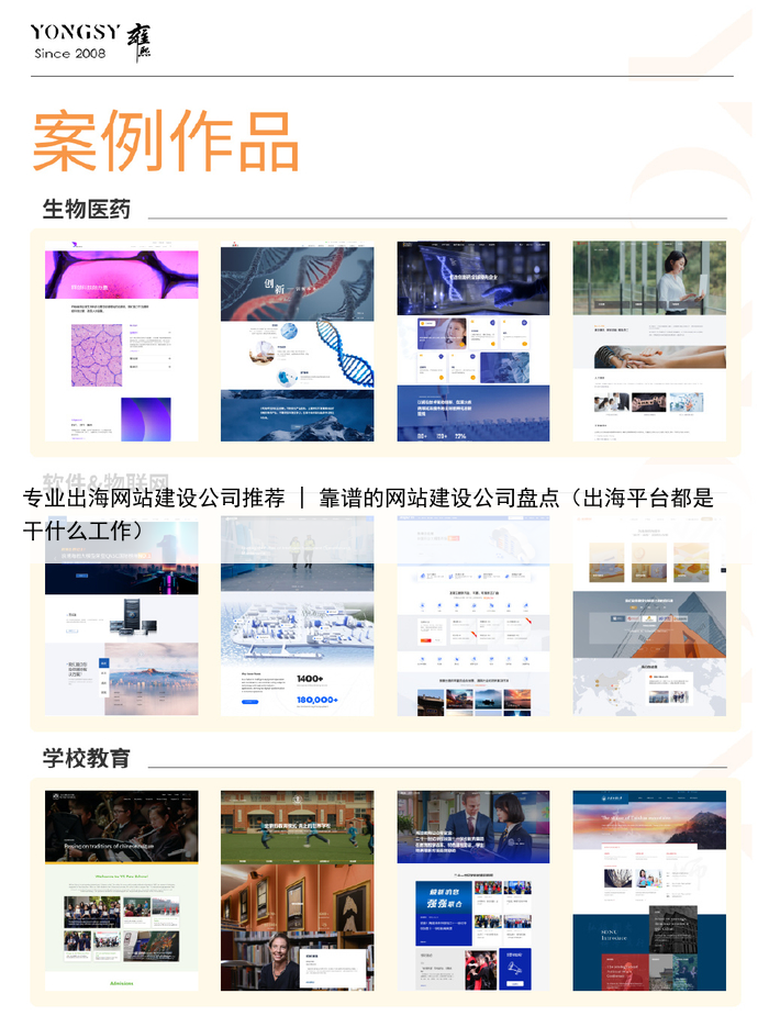 一、上海雍熙YONGSY上海雍熙是一家专注于高端数字化品牌建设与出海营销解决方案的服务商,致力于帮助中国ToB企业高效、合规、专业地走向全球市场面对国内市场竞争日益激烈、全球化布局成为企业增长新引擎的趋势,雍熙凭借十余年服务宁德时代、科大讯飞、固德威、宇通客车、浪潮、京东方等500强及行业领军企业的实战经验,打造了一套成熟、系统、可落地的“出海网站建设与数字营销一体化”服务体系。