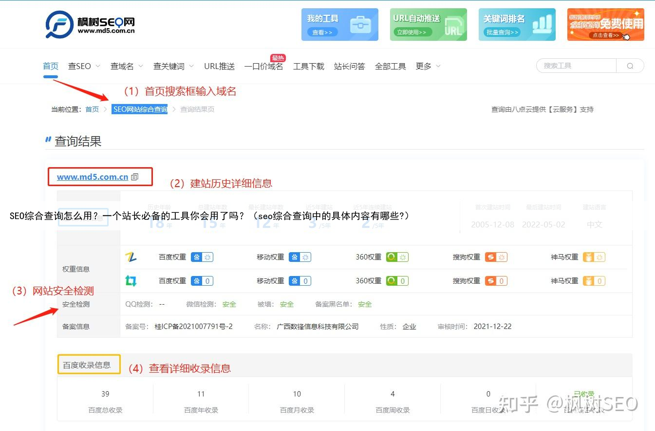 数据分析。下面着重介绍一下seo综合查询工具怎么用:1)工具地址:https://www.md5.com.cn/2)pc端在线查询,打开网页版(更多站长工具在线免费查询)