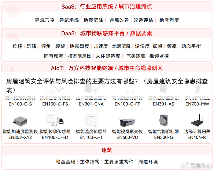 三是在线监测与预警,借助WITBEE®万宾科技®建筑结构健康监测系统,实现房屋建筑的安全性在线评估其中,建筑结构健康监测系统是促进房屋建筑安全监测向自动化、信息化、网络化方向发展的重要力量它依托高精度传感器、无线通信技术与云端数据平台,可以实现全天候、全天时作业,覆盖范围广、测量精度高,可以实时反映建筑在实际使用过程中的动态变化,是城市生命线创新工程的重要组成部分。