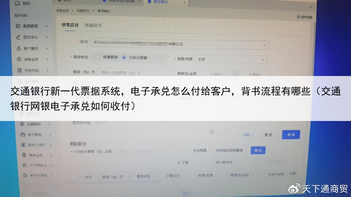 交通银行新一代票据系统,电子承兑怎么付给客户,背书流程有哪些你学会了吗?你的关注、评论+点赞,就是我创作的最大动力。(天下通商贸-您贴身的票据专家,做票据服务的领导者,面对商票融资难不再困惑)