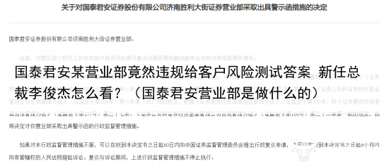 国泰君安某营业部竟然违规给客户风险测试答案 新任总裁李俊杰怎么看?(国泰君安营业部是做什么的)