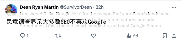 这种情绪的转变可以归因于谷歌最近的行为受到越来越多的审查,这给搜索引擎优化带来了挫败感这些问题包括垃圾邮件、排名波动和搜索错误许多SEO人员对Google最近的行为表示不满,引发了对SERP未来的猜测以下是SEO 对 X 的评价: