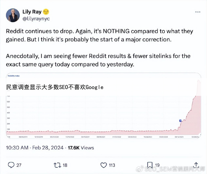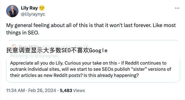 “如果 Reddit 的排名继续超过个别网站,我们是否会开始看到 SEO 发布其文章的‘姊妹’版本作为新的 Reddit 帖子?这已经发生了吗?”莉莉·雷 回复: