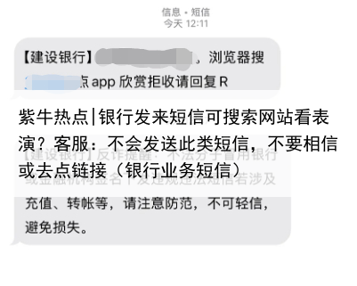 紫牛热点|银行发来短信可搜索网站看表演?客服:不会发送此类短信,不要相信或去点链接(银行业务短信)