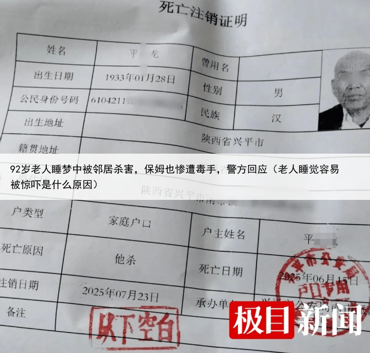 92岁老人睡梦中被邻居杀害,保姆也惨遭毒手,警方回应(老人睡觉容易被惊吓是什么原因)