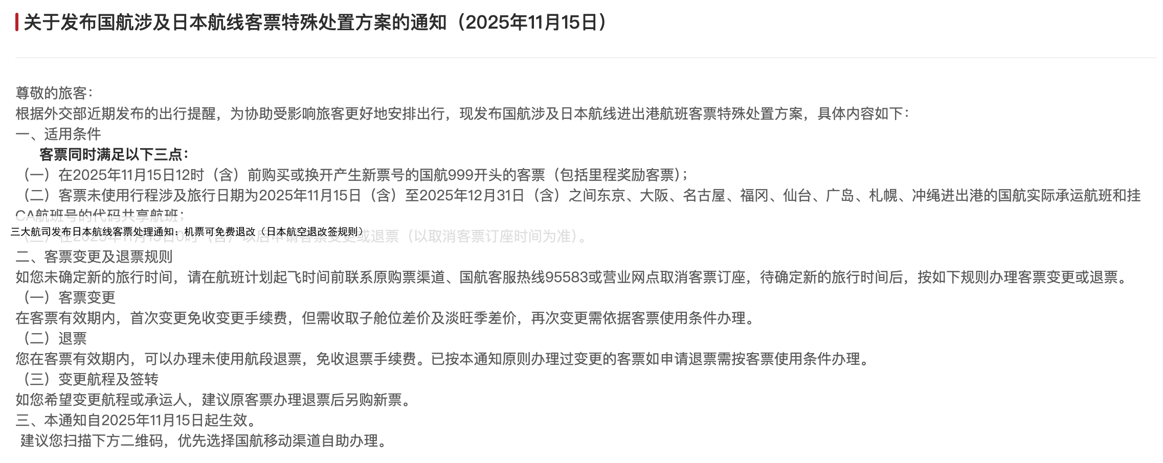 11月15日,中国南方航空股份有限公司发布《关于日本航线客票特殊处理的通知》,中国国际航空股份有限公司发布《关于发布国航涉及日本航线客票特殊处置方案的通知》,中国东方航空股份有限公司发布《关于日本相关航线客票特殊处理的通告》。