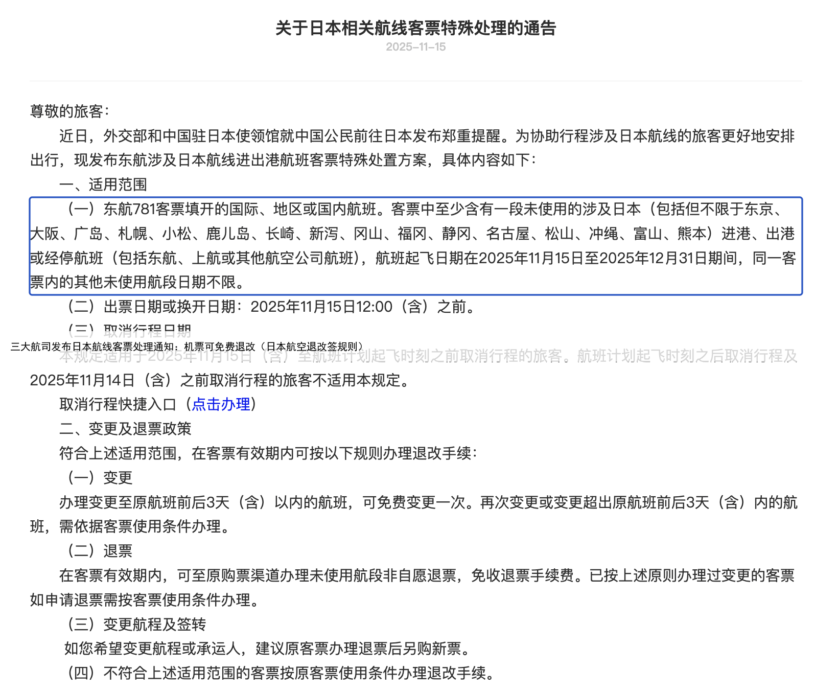 东航表示,为协助行程涉及日本航线的旅客更好地安排出行,现发布东航涉及日本航线进出港航班客票特殊处置方案,凡客票中至少含有一段未使用的涉及日本(包括但不限于东京、大阪、广岛、札幌、小松、鹿儿岛、长崎、新泻、冈山、福冈、静冈、名古屋、松山、冲绳、富山、熊本)进港、出港或经停航班(包括东航、上航或其他航空公司航班),航班起飞日期在2025年11月15日至2025年12月31日期间的,可免费变更一次,退票则免收退票手续费。