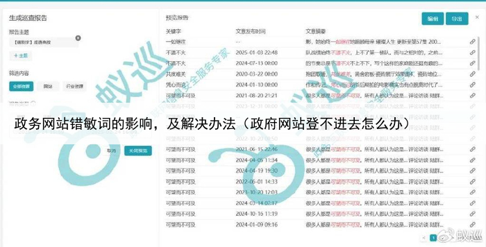 政务信息的传播范围广泛,一旦出现问题,可能迅速扩散并造成不良社会影响3、违反法律法规某些敏感词的使用可能违反《政府信息公开条例》等相关法规,导致法律风险或行政处罚二、解决办法蚁巡政务信息巡查系统通过以下功能有效解决错敏词问题:。