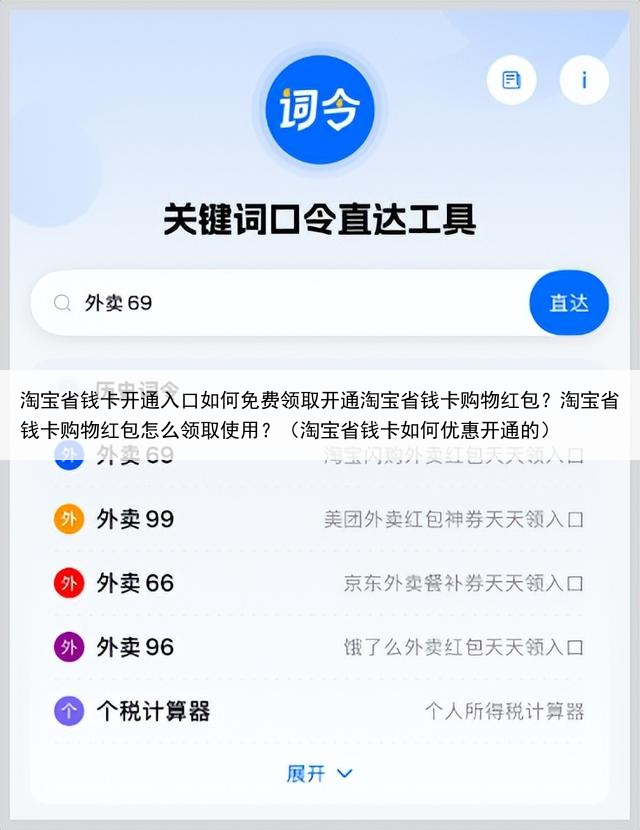 淘宝省钱卡如何免费领取开通淘宝省钱卡购物红包?1、打开词令APP,输入口令“ 外卖69 ”;