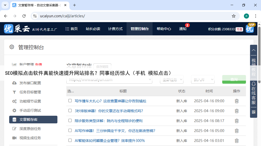 他特别欣赏系统的热点植入功能,这能让内容更具时效性和吸引力通过设置合适的原创度提升选项,他确保了内容的独特性和质量优采云如何帮助SEO优化在优采云的帮助下,张明远重新构建了网站的内容体系他设置了多个采集任务,针对不同的目标关键词进行内容布局。