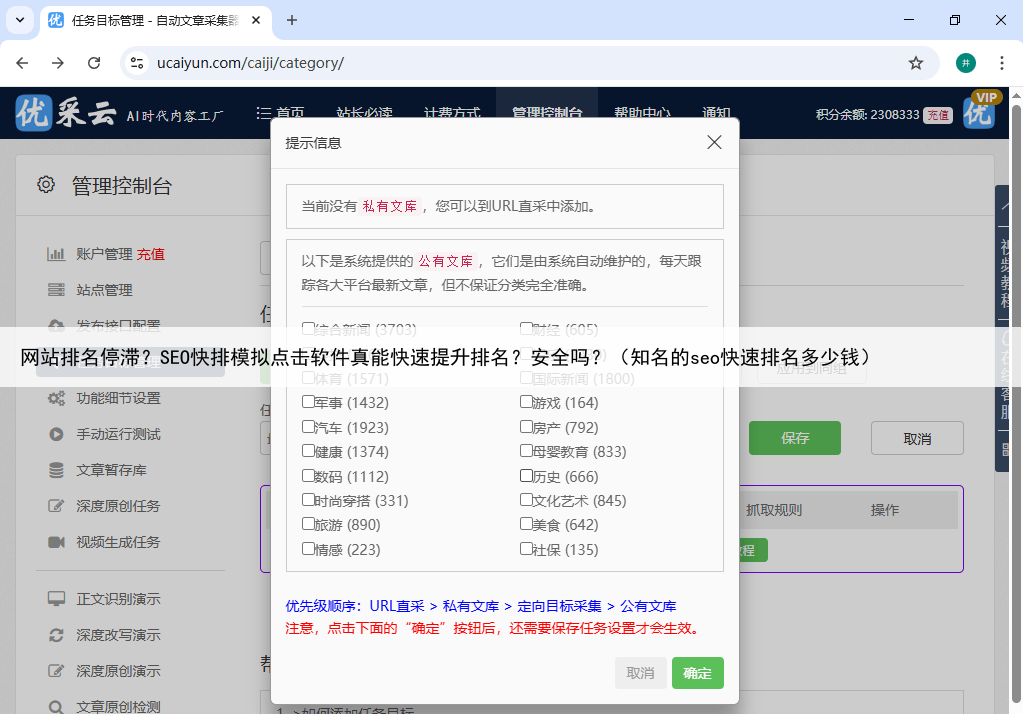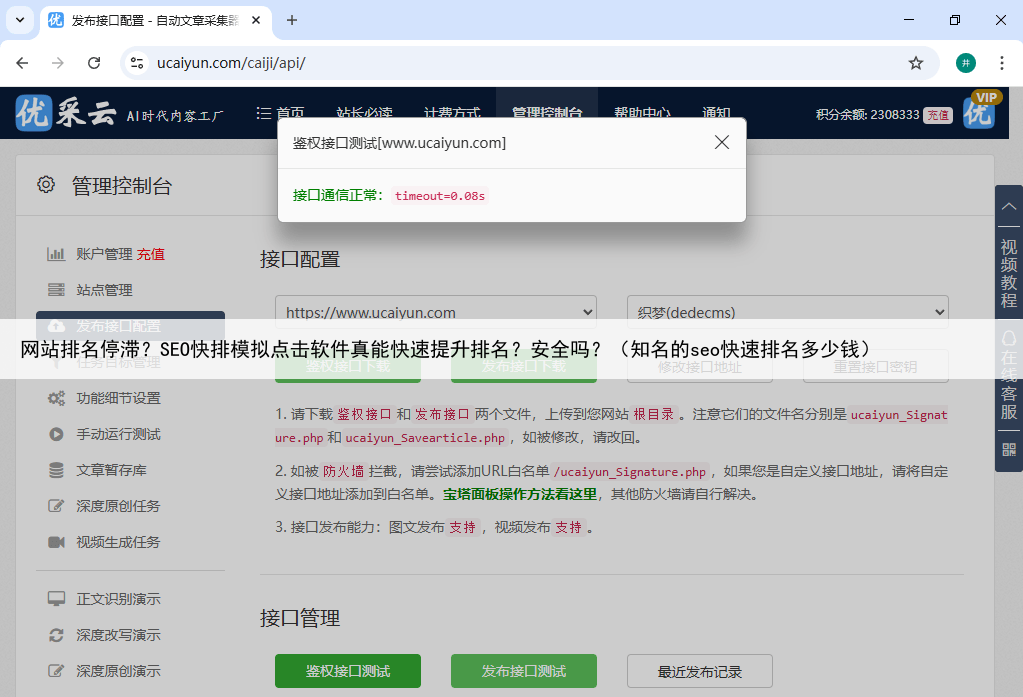 SEO快排模拟点击软件与合规优化工具哪个更有效?回顾这段经历,林宇深感专业工具的重要性,但更重要的是选择正确合规的工具SEO快排模拟点击软件可能短期内有效,但风险高且不可持续;而像优采云这样的内容自动化工具,虽然效果不会立竿见影,但长期来看更加稳定可靠。